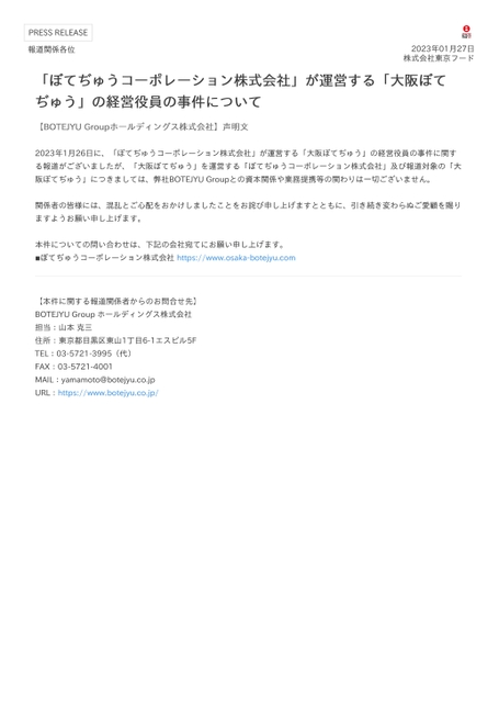 「ぼてぢゅうコーポレーション株式会社」が運営する「大阪ぼてぢゅう」の経営役員の事件について PR / 1.27.2023