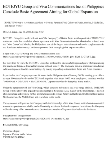 🇺🇸BOTEJYU Group and Viva Communications Inc. of Philippines Conclude Basic Agreement Aiming for Global Expansion PR / 1.30.2023