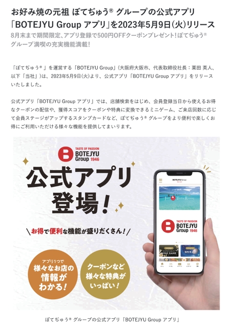 ぼてぢゅう®︎グループ:公式アプリ「BOTEJYU Groupアプリ」リリース PR / 5.9.2023
