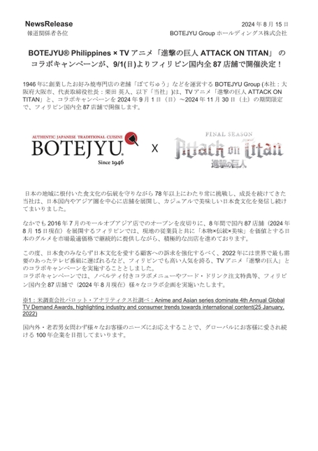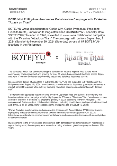 BOTEJYU Group【フィリピン】 × TV「進撃の巨人」コラボキャンペーン ! PR / 8.15.2024