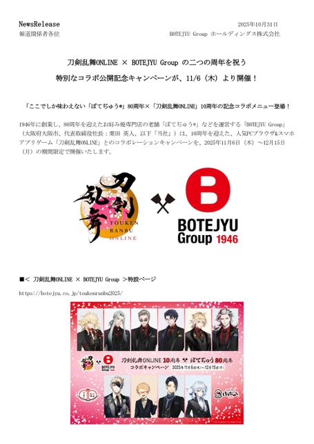 BOTEJYU®︎ Group × 刀剣乱舞ONLINE コラボキャンペーン! PR / 10.31.2025